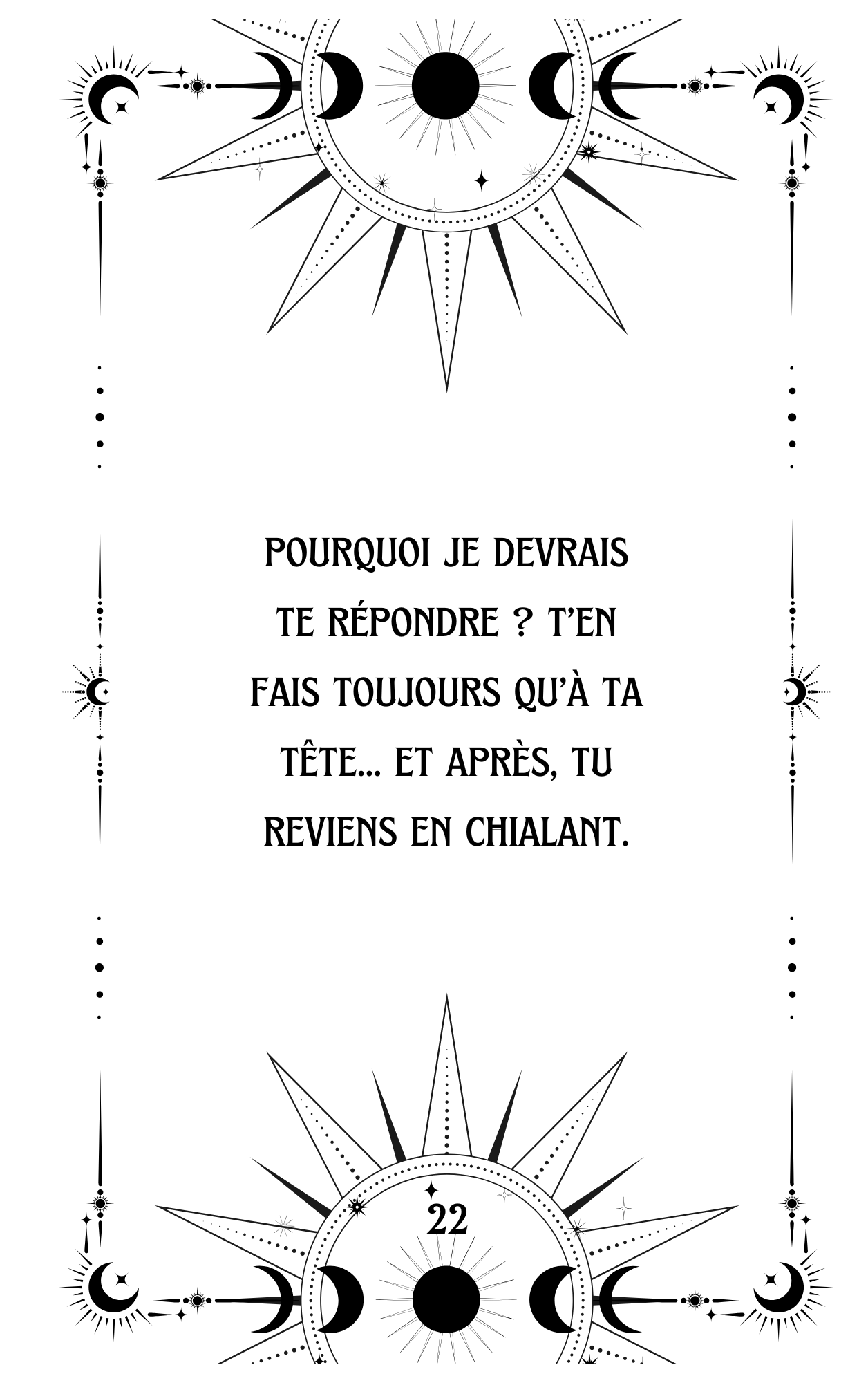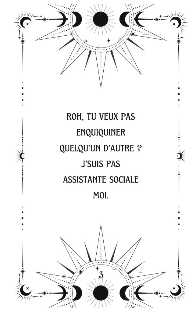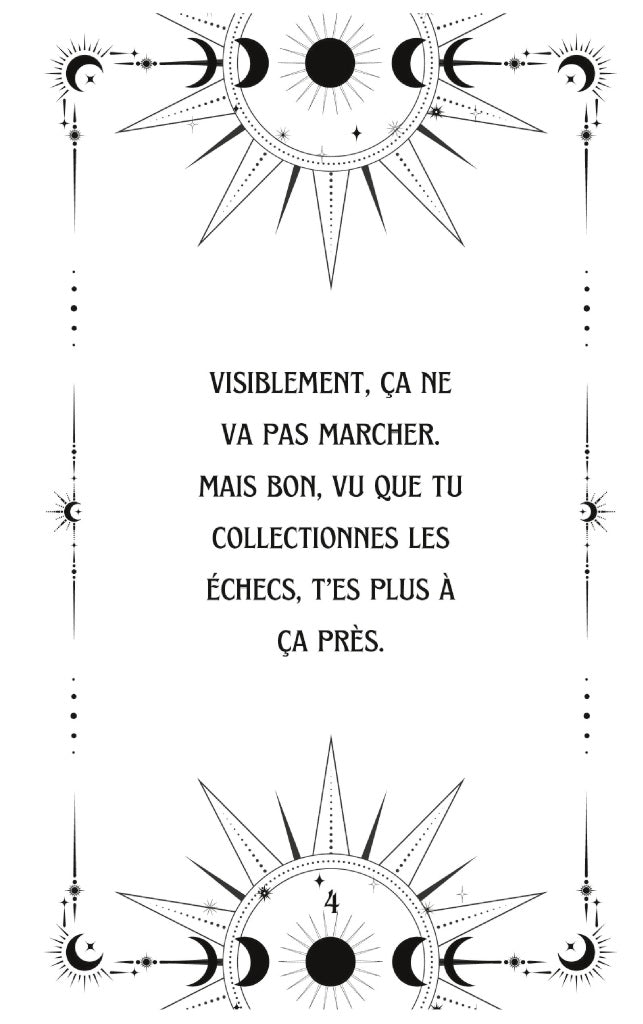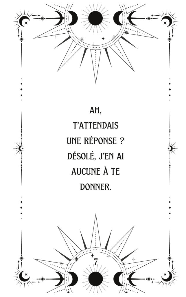 Super petit oracle, simple et drôle ! Très sympa quand on aime un peu de légereté, que ce soit pour se faire rembarrer à coups de commentaires (gentiment) mordants, ou pour recevoir un peu de validation ça fait toujours plaisir, et puis quand ça tombe juste ça peut permettre de reconnaître nos petites réalités embarassantes parfois ^^'